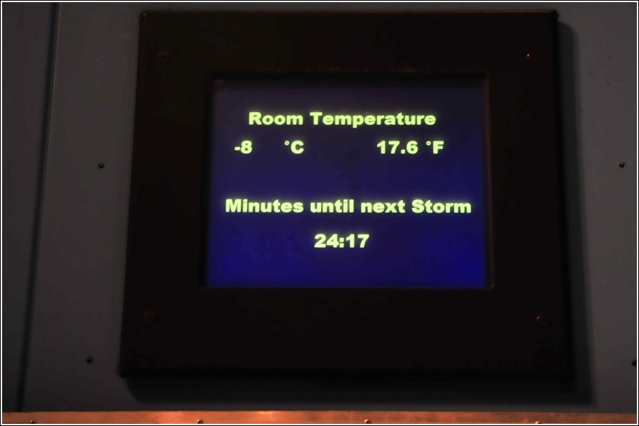 南極風暴體驗館廣播說氣象預報將有超級風暴來襲,大門已經上鎖,請遊客們注意自身安全。館內開始狂風大作,由牆上電視螢幕可以了解實際風速與氣溫,這二個數據突然像電腦中毒一樣,風速急速上升,氣溫陡降。
