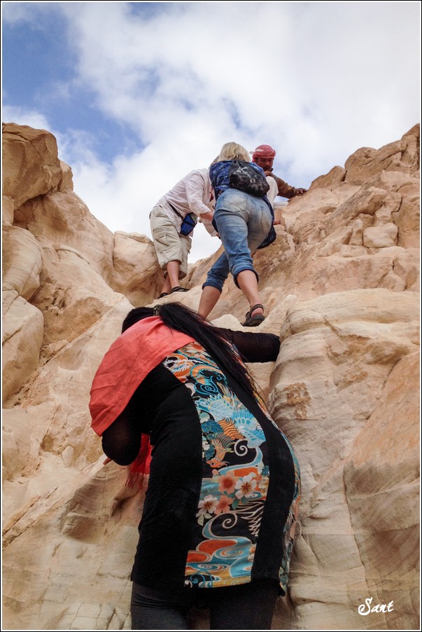 旅遊經理說我們會先進入彩色峽谷,中午在綠洲享用貝都因人的午餐,下午健行白色峽谷,但是老狼覺得旅遊經理搞錯了,這裡應該是白色峽谷,因為峽谷內的顏色非常淡,拍照的顏色都怪怪的,人像的臉都是黑色的,只有這張是用Sony RX100打閃光燈,所以小狼才稍有臉色,其他沒打開閃光燈所拍的人像通通是黑面狼君,原本以為相片回家後製作業可以調整,結果沒辦法,岩石顏色太蛋、太亮,岩石與人像光線反差太大。