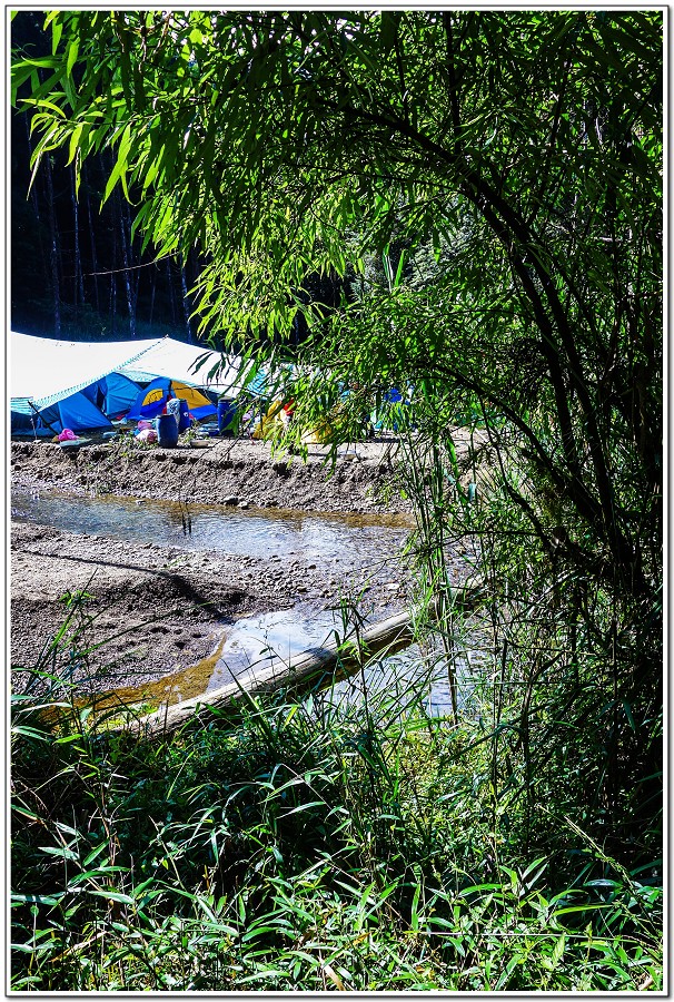午後雷陣雨準時報到,在雨中只有工寮可以遮雨和煮中餐,大家不願意進工寮,裡頭又髒又臭,經得大家同意放棄中餐,大家都想早一點下山,趕到杉林溪廁所休息和更換身上的臭衣物!